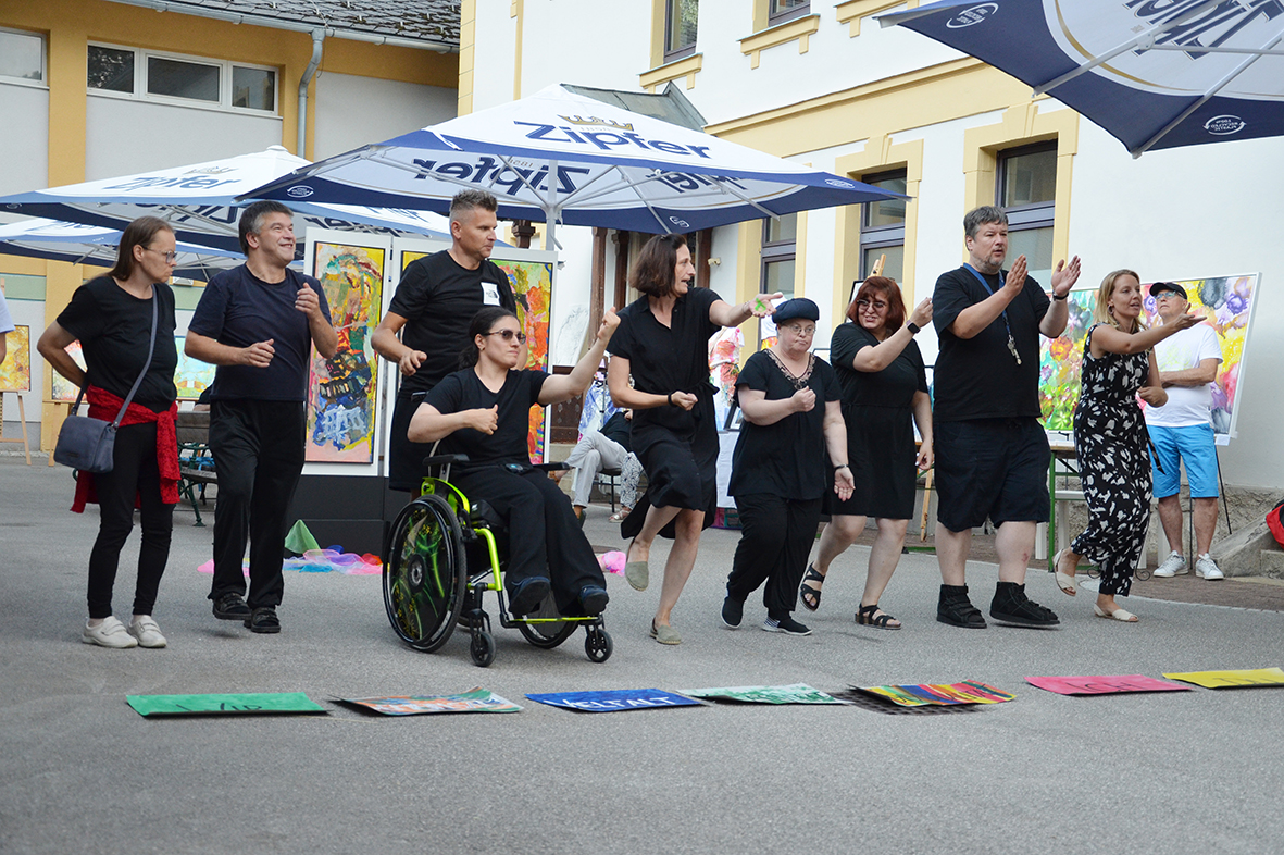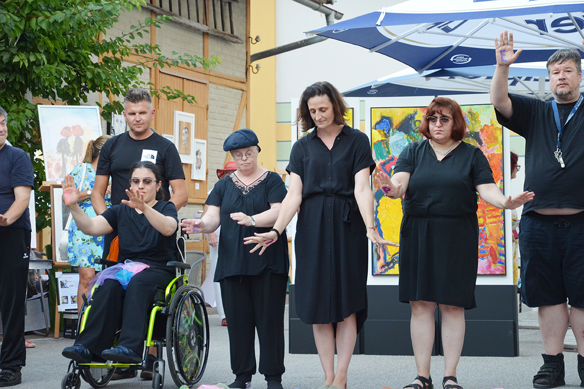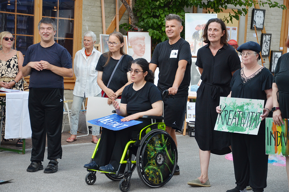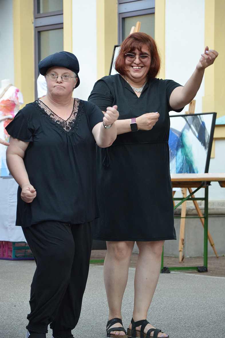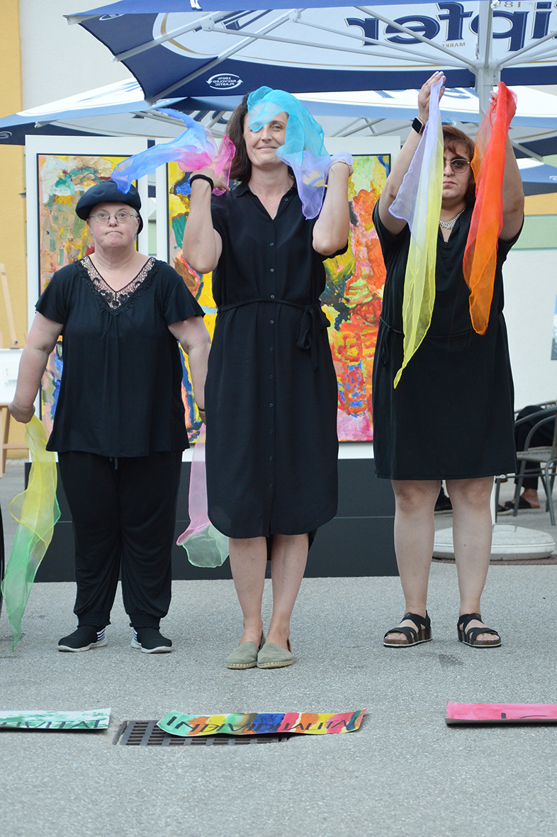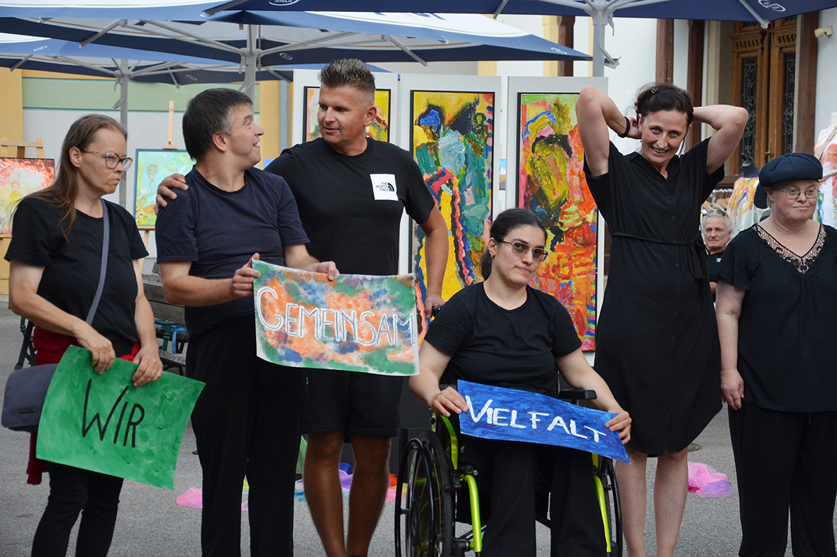 Beim dritten, von der Künstlerin Karoline Kornek initiierten Künstler*innenfest beim Lokschuppm in Klaus, trat vergangene Woche die seit kurzem in Schön bestehende Tanzgruppe „TanzVielfalt“ auf. Betreuerin Bettina Renz hatte mit unseren Kund:innen einen beeindruckenden Tanz einstudiert. Unterstützt wurde sie dabei auch von ihrem Kollegen Matúš Luckeneder aus der Fähigkeitsorientierten Aktivität und der agogischen Leiterin von Schön, Julia Hackl.