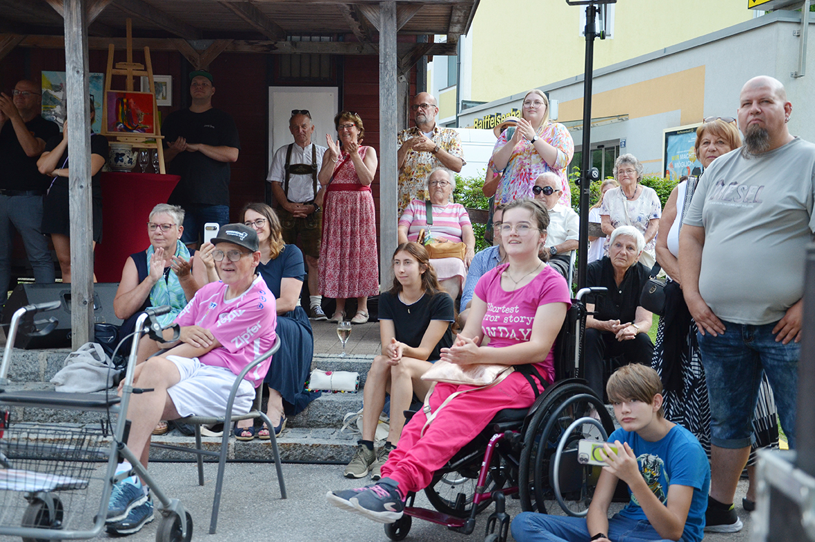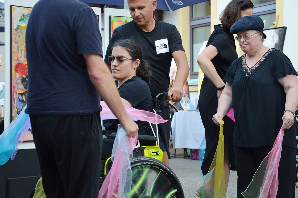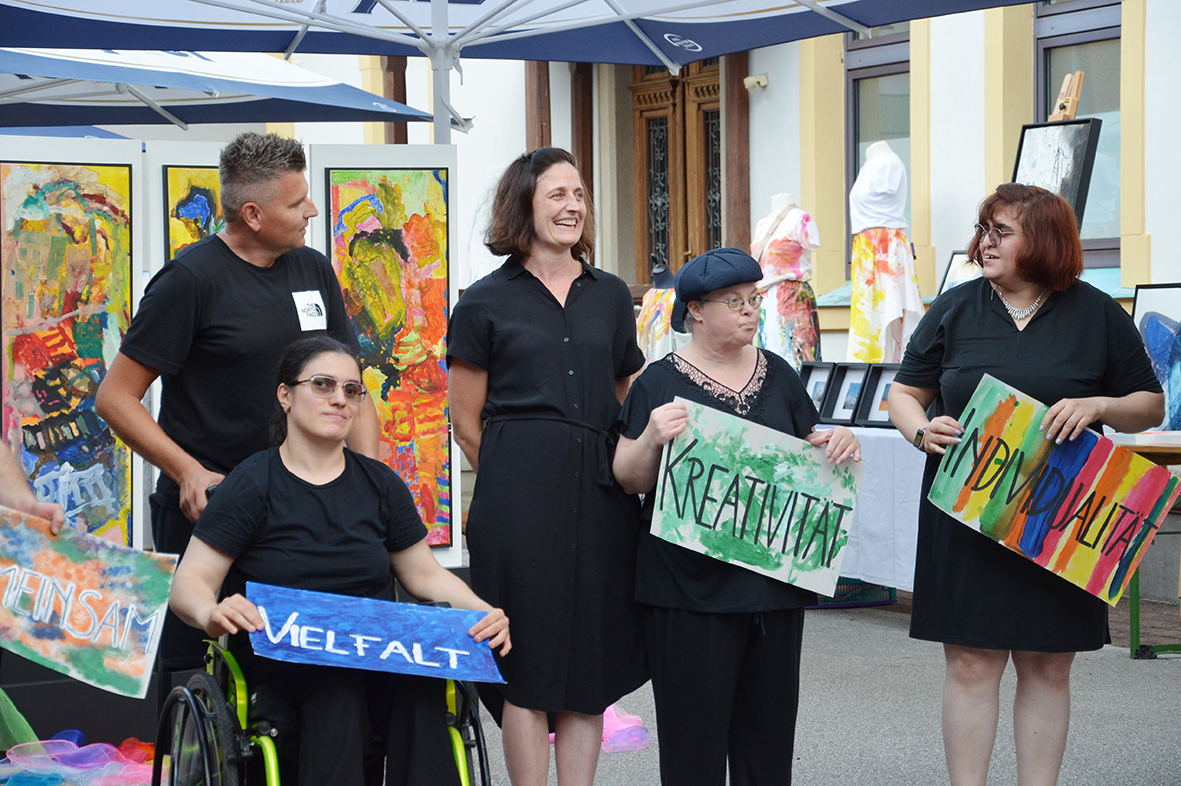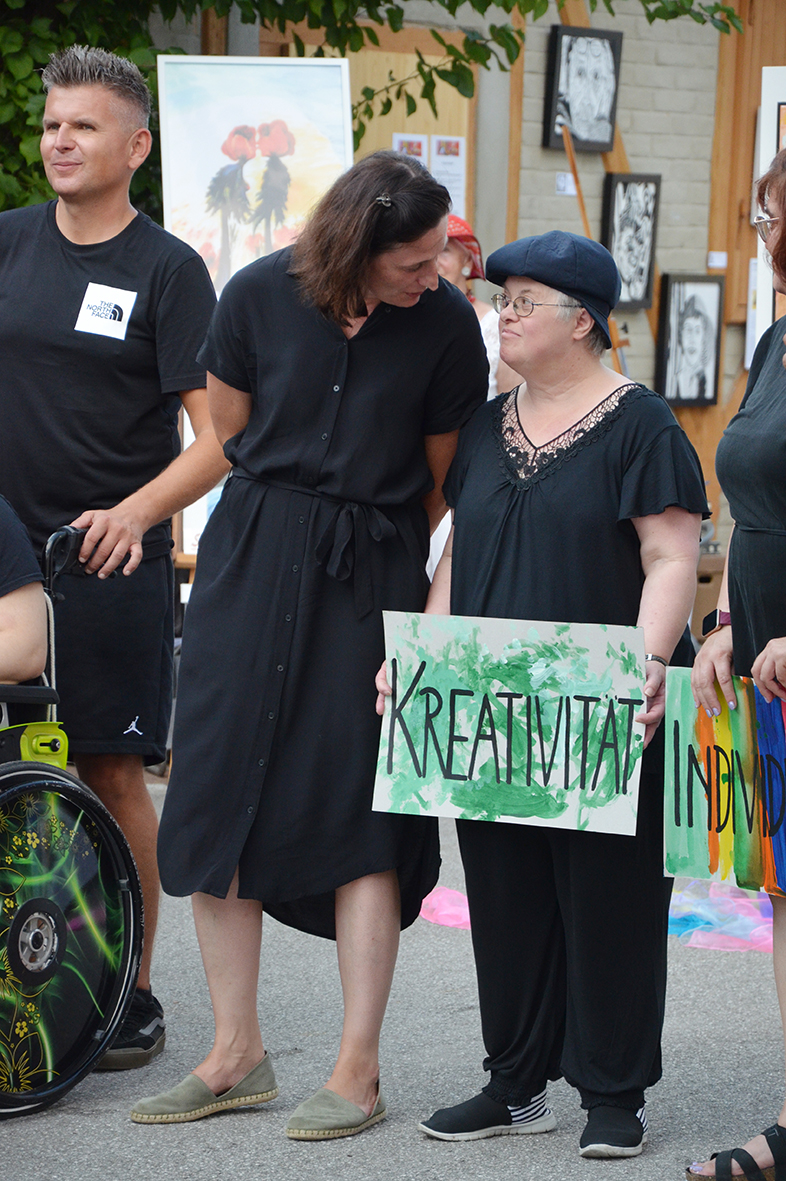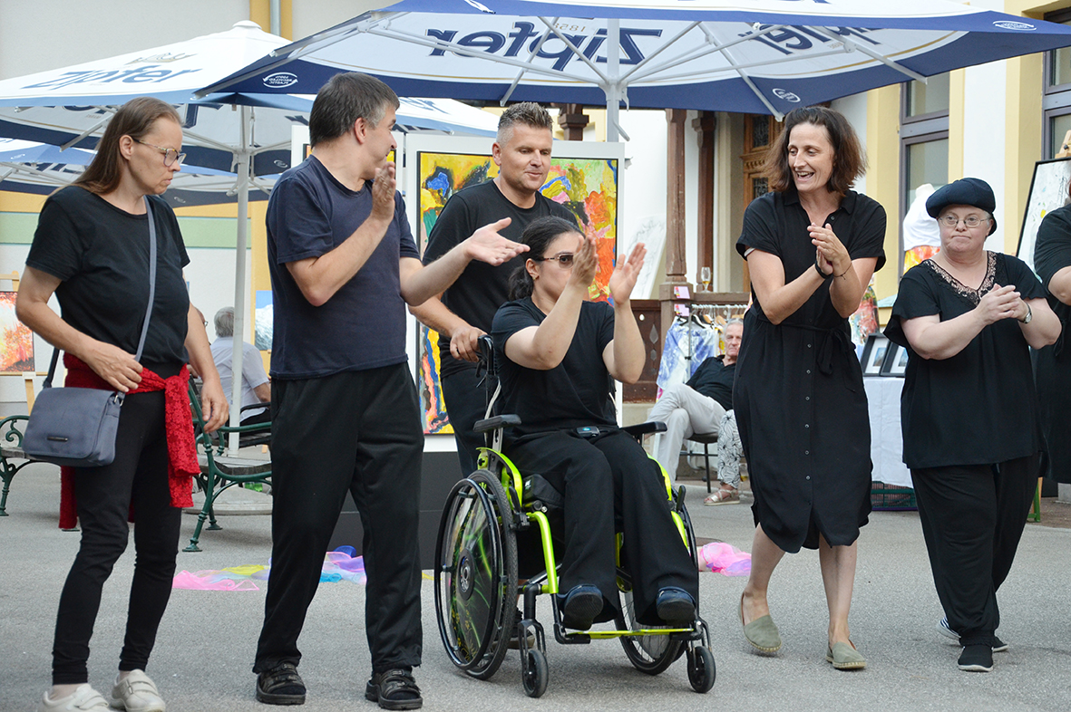 Beim dritten, von der Künstlerin Karoline Kornek initiierten Künstler*innenfest beim Lokschuppm in Klaus, trat vergangene Woche die seit kurzem in Schön bestehende Tanzgruppe „TanzVielfalt“ auf. Betreuerin Bettina Renz hatte mit unseren Kund:innen einen beeindruckenden Tanz einstudiert. Unterstützt wurde sie dabei auch von ihrem Kollegen Matúš Luckeneder aus der Fähigkeitsorientierten Aktivität und der agogischen Leiterin von Schön, Julia Hackl.